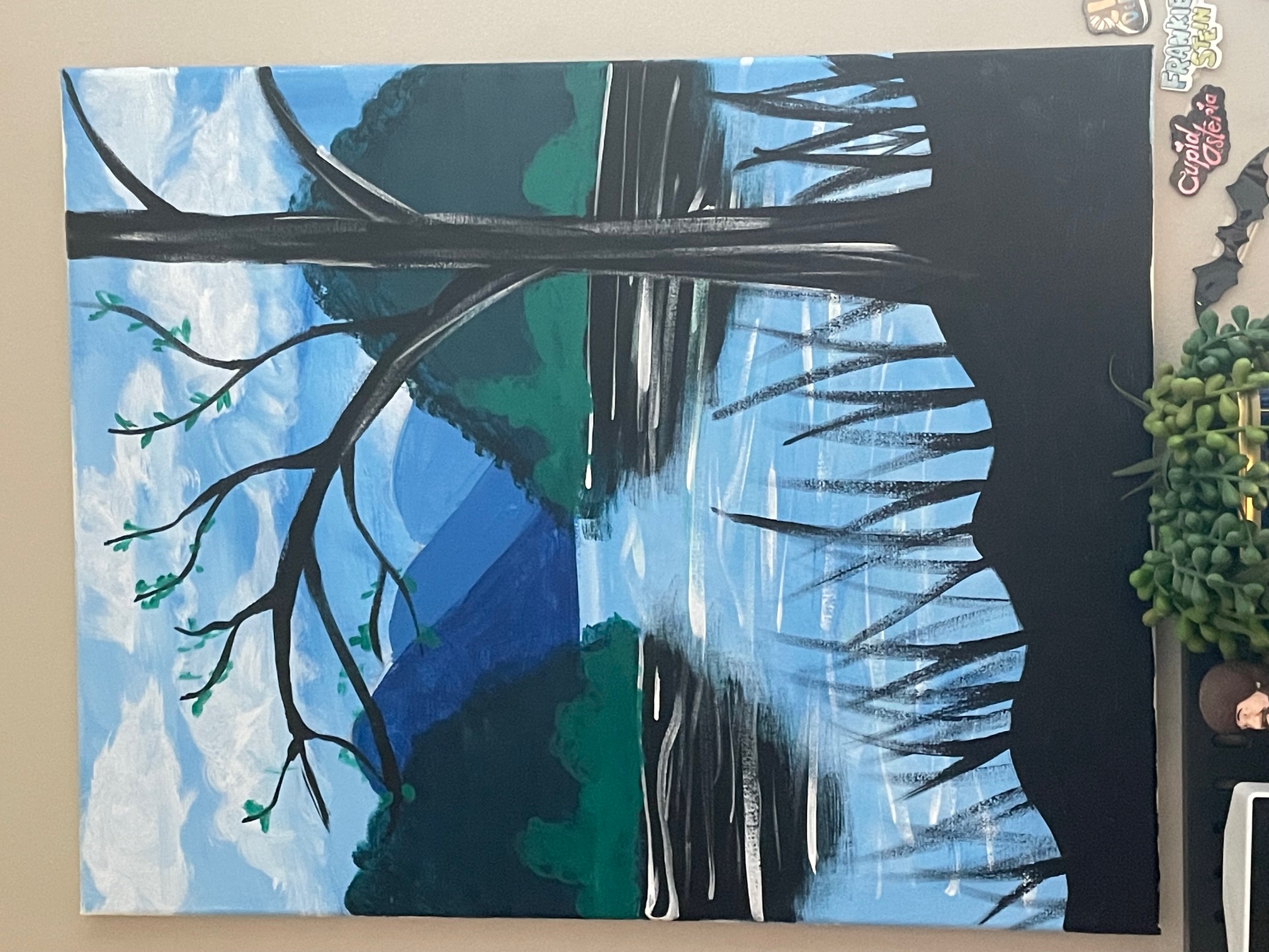 I went to a painting class/workshop thing with my friend and her family since her cousin got sick. 10/10 experience we had so much fun. even if it's not something I'm proud of it's a neat memory so I put it on my wall above my desk hehe